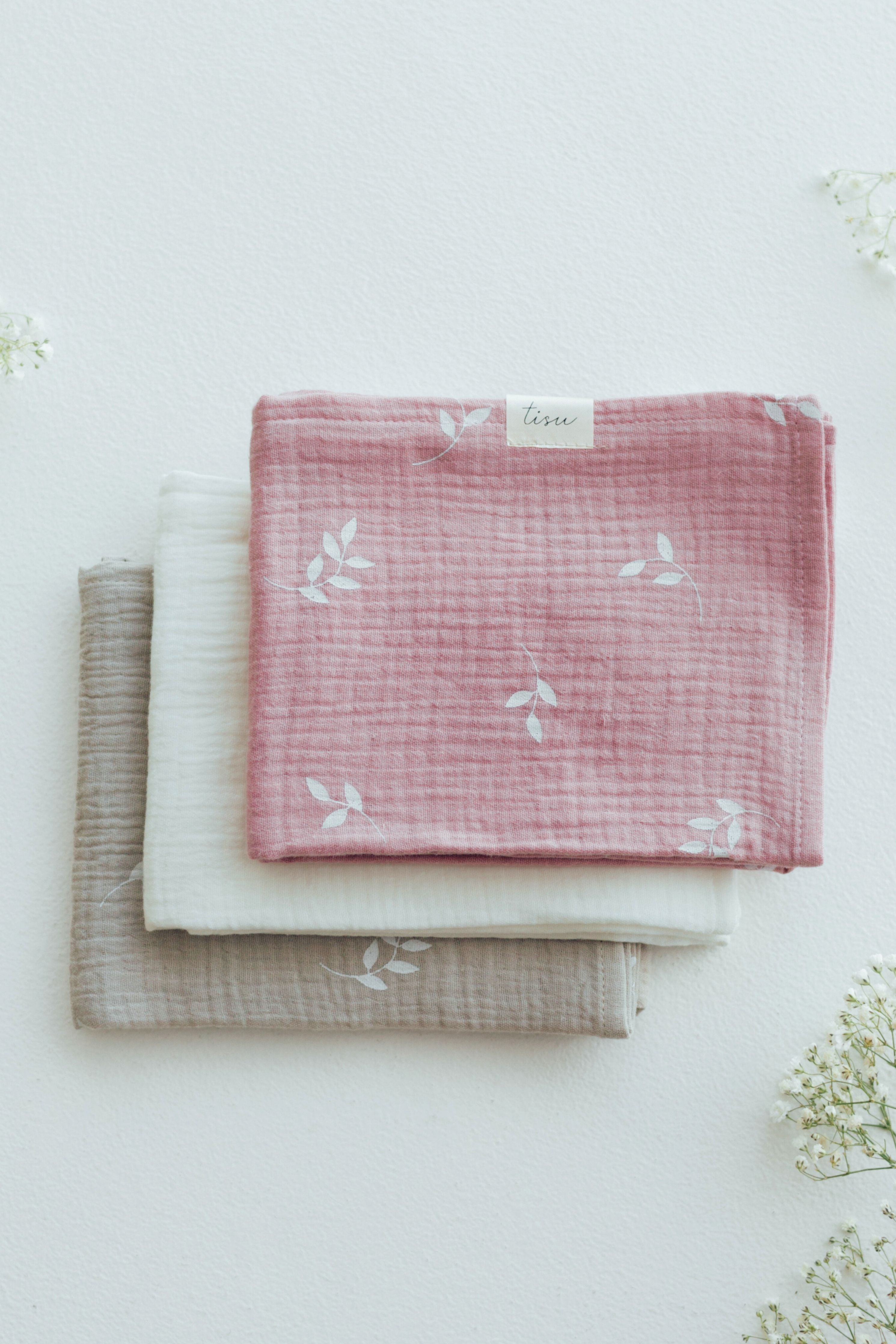 TISU muslin set: Blush Leaves + White Pearl + Beige Leaves