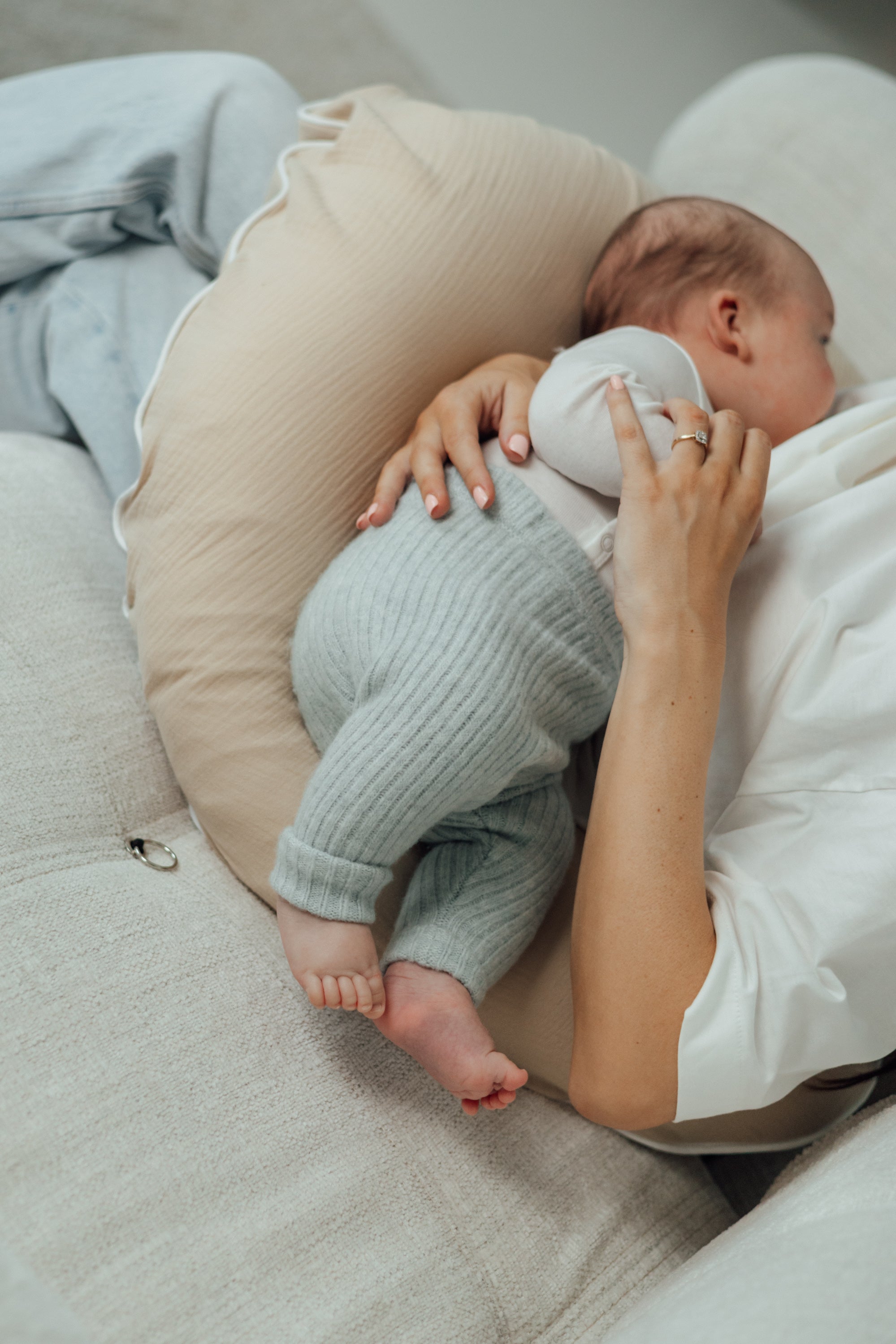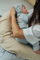 The TISU x SleepAngel nursing pillow functions like a large yet gentle support ring around the body of a mother recovering from childbirth—holding, supporting, and stabilising both mother and baby. The pillow does not need ongoing adjustment: it stays firmly in place, maintains its shape, and supports a stable breastfeeding position.